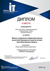 2 место в номинации «Пространственные данные» за проект «Модель управления инфраструктурным развитием Приморского края на основе пространственных данных»