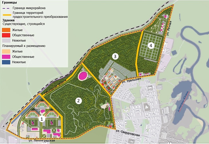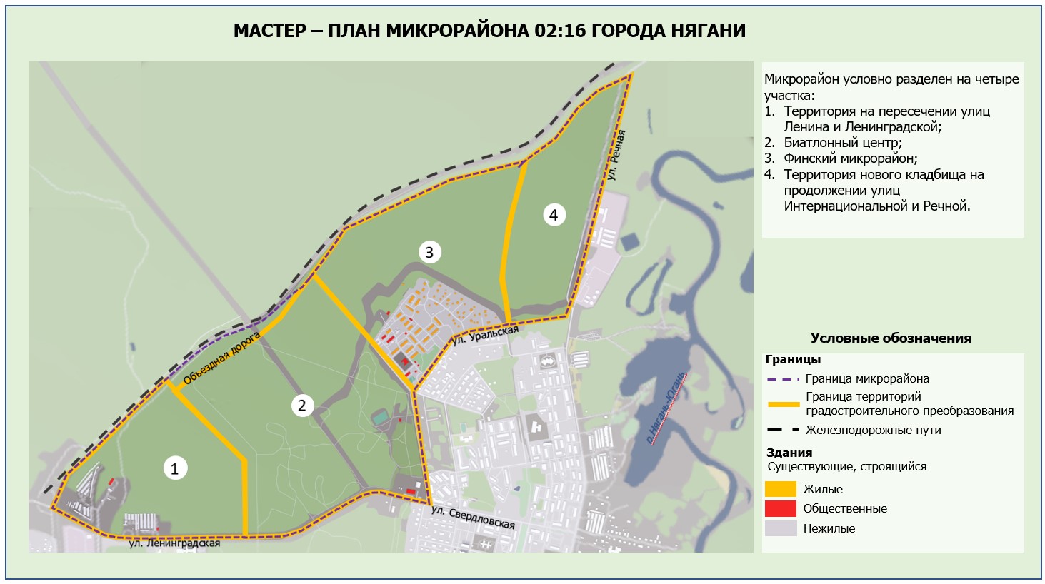 В результате разработки мастер-планов на все территории градостроительного преобразования общей площадью 1 873 га были сформированы цели и задачи территориального развития, выявлены городские ценности, сгенерированы идеи, обеспечен баланс общественных и частных интересов. Каждая территория имеет свои уникальные черты и неповторимый характер, что делает г. Нягань многоликим и привлекательным. Например, территория микрорайона, в северной части города, где большую часть участка занимает городской лес, а в центральной его части расположена биатлонная трасса (рис. 1).