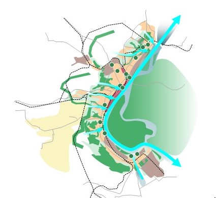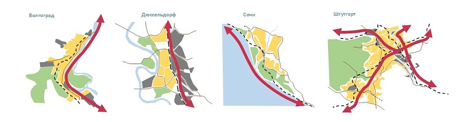 Территориальное планирование линейных городов имеет ряд особенностей, связанных с определением таких урбанистических структур. Линейный город формируется прежде всего вокруг транспортной артерии – автомобильной или железнодорожной магистрали, водного пути. Следовательно, все процессы градостроительного освоения территории подвержены влиянию этого фактора. Линейная структура города достаточно распространена в мировой практике (рис.1)