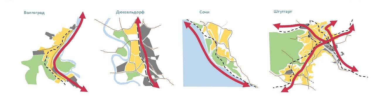 Основной проблемой линейного города является недостаточная связность структуры, что часто возникает при большой протяженности населенного пункта. Районы Волгограда формировались по похожему сценарию: ядро в виде производственного предприятия и окружающая его жилая застройка с общественными объектами. Со временем эти единицы структуры становились более обособленными. Расширение территории города за счет сельских населенных пунктов во 2-й половине XX в. не привело к кардинальным изменениям: периферийные территории существенно не повлияли на консолидацию структуры Волгограда. Основные производственные предприятия сформировались у набережной Волги. Подъездные железнодорожные пути к промышленным зонам затрудняли доступ горожан к реке, у города не было привлекательных с точки зрения рекреации территорий. Балочно-овражная система города не получила развития как потенциальный зеленый каркас и выступала разъединяющим фактором планировочной структуры.